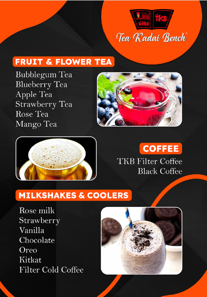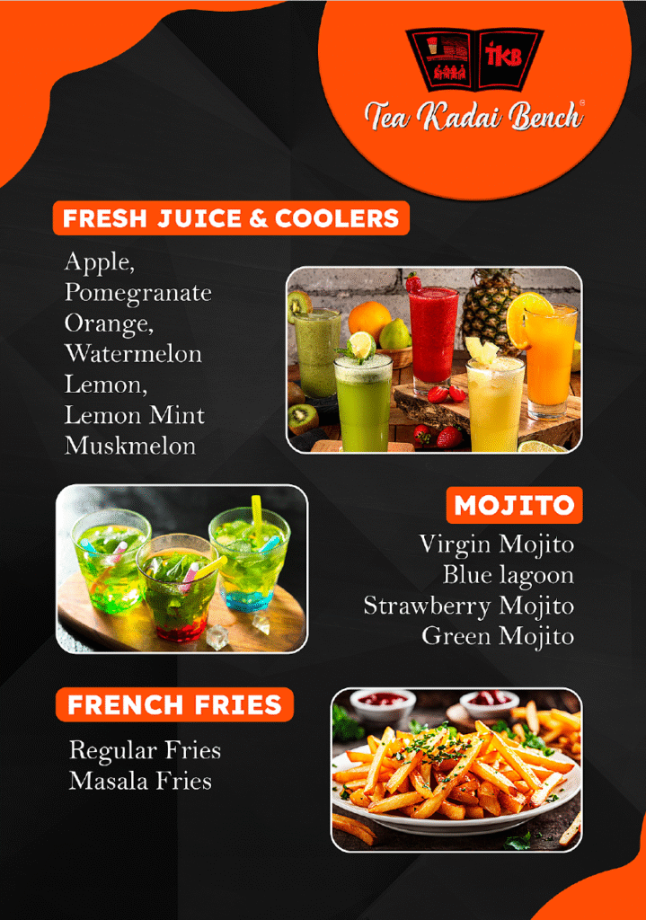 The journey of Tea Kadai Bench follows back to Pondicherry, One of the busiest towns which offer’s one of the most traditional and most cherished drinks of India- Tea. Tea Kadai Bench as the title commands makes delightful Tea’s in a special fashion superbly blending it up with different flavors and other fine ingredients. Apart from the Tea’s, the ace chefs of Tea Production line offers an assortment of Mocktails , Fries, Nuggets, Milkshakes , Juices & snacks.